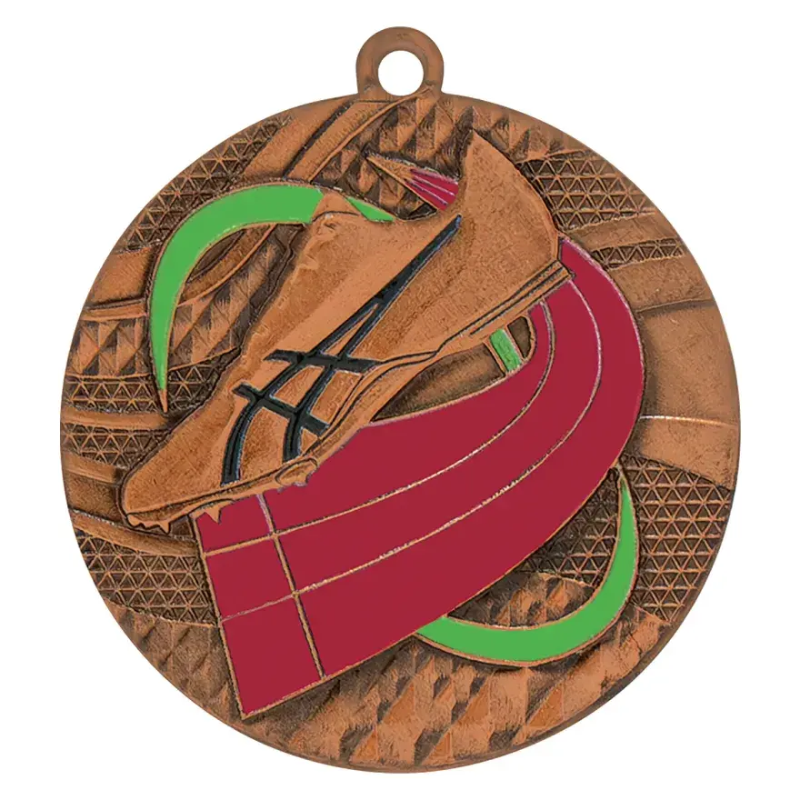 Classic antique medal featuring distinctive two-toned design. Medal a fantastic option for track and running events with a winners cup inspired design. Ribbons available in all colours and medal boxes to suit.
