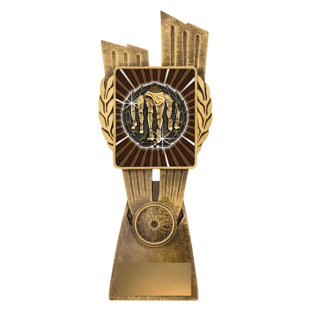 Antique Gold Lynx trophy features a classic wreath design and vibrant theme. These running trophies offer the option of including your custom logo over various sizes.
