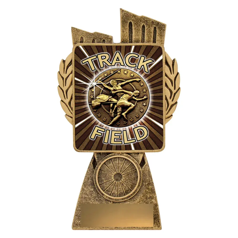 Antique Gold Lynx trophy features a classic wreath design and vibrant track & field theme. These athletics trophies offer the option of including your custom logo over various sizes.