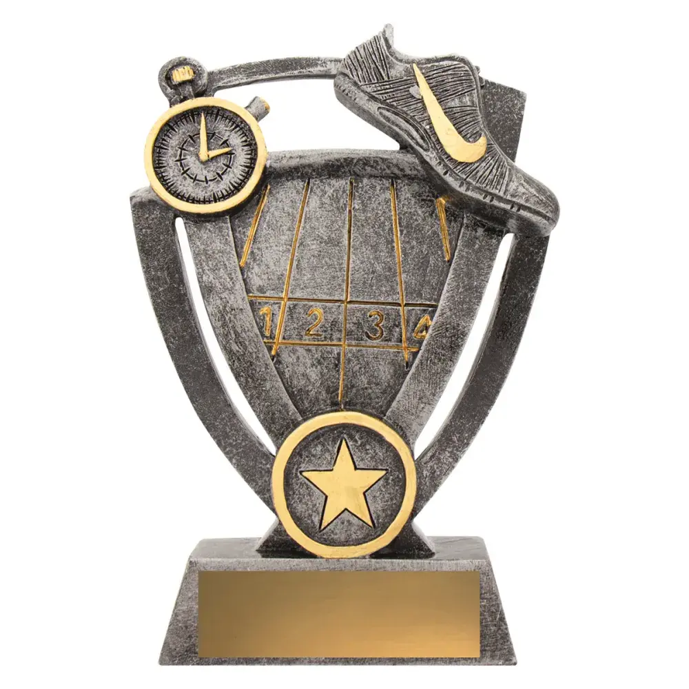 Athletics trophies in antique silver and gold offer excellent value over various sizes. Generic theme award with the option for customisation.