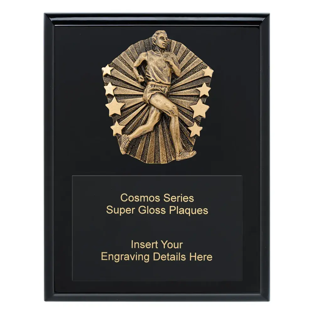 Range of super gloss plaques in classic black with brilliant Cosmos fronts and matte black engraving. Choose plaque - available in 3 sizes - to suit your sport or activity.