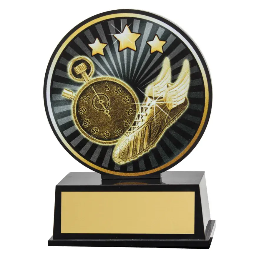 Perfect running trophies complete with dynamic design showcasing the running shoe - excellent award idea for range of athletics activities.