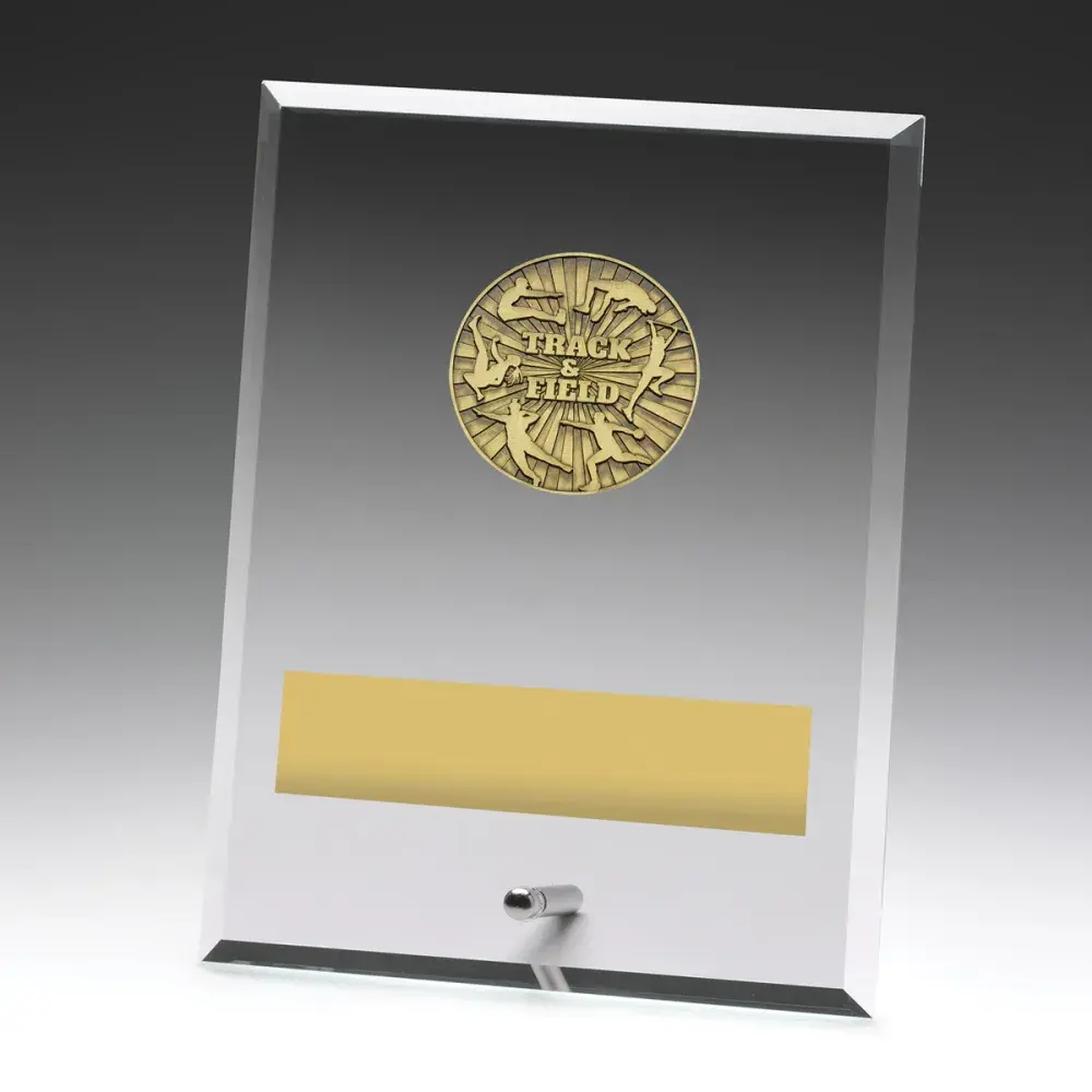 Smart, more prestige award option with elegant glass plaques in 3 great sizes. Available in premium gift boxes. Metal centre fronts available in variety of sports and activities. Multiple options for your engraving.