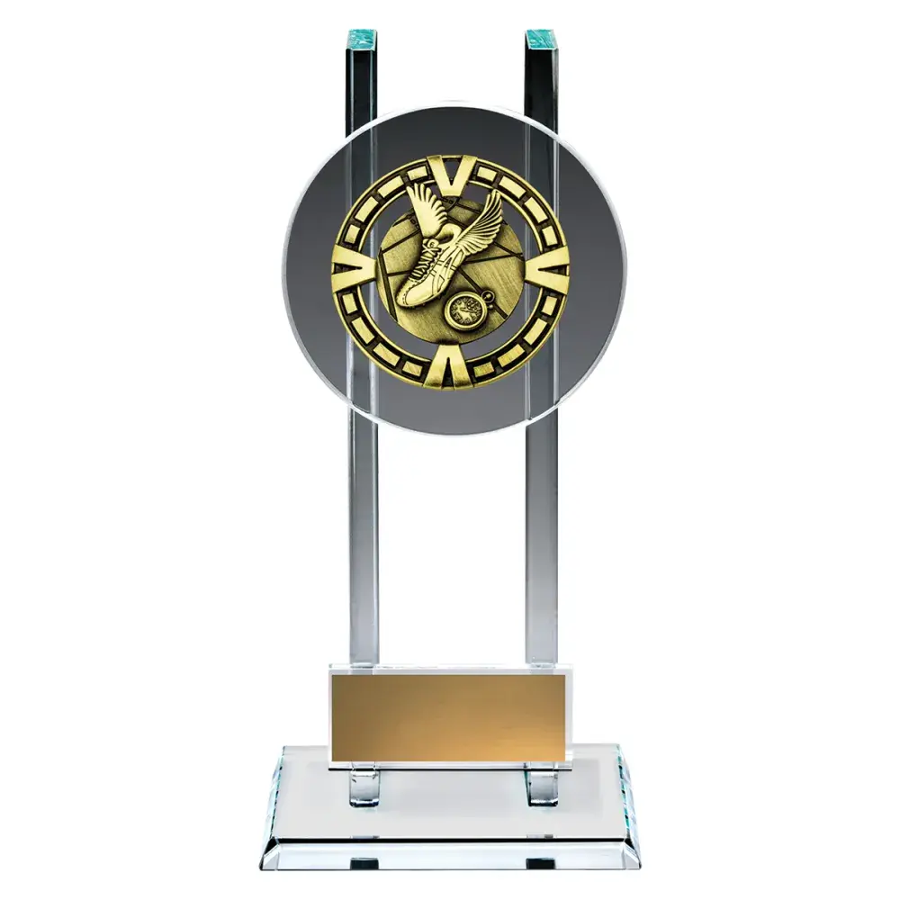 Bold glass awards are perfectly suited to recognise the top achievements at your team or club. Elevated glass platform showcases a brilliant metal theme for your sport or activity - space for your engraving as well.