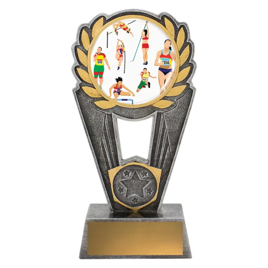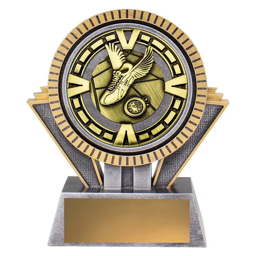 Husky series of trophies on premium black marble allows for different award options for your activity. Appealing antique silver and gold combination over number of sizes.