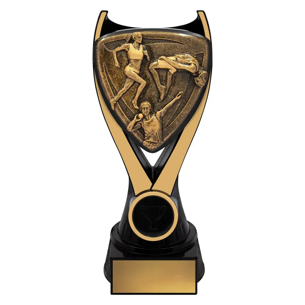 Nova series of trophies present a unique black & gold colour combination with a bold 3D type design to really celebrate the sport or activity of your awards.