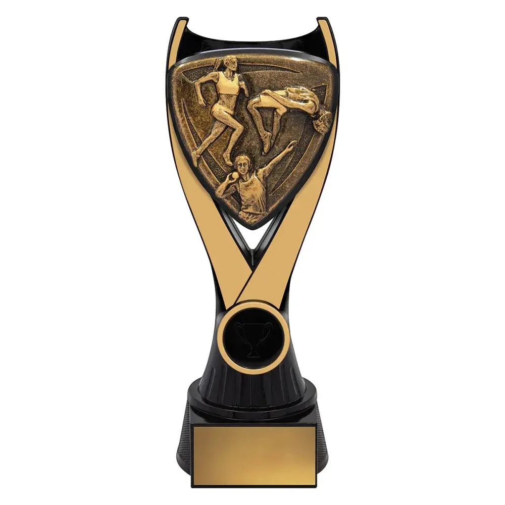 Nova series of trophies present a unique black & gold colour combination with a bold 3D type design to really celebrate the sport or activity of your awards.