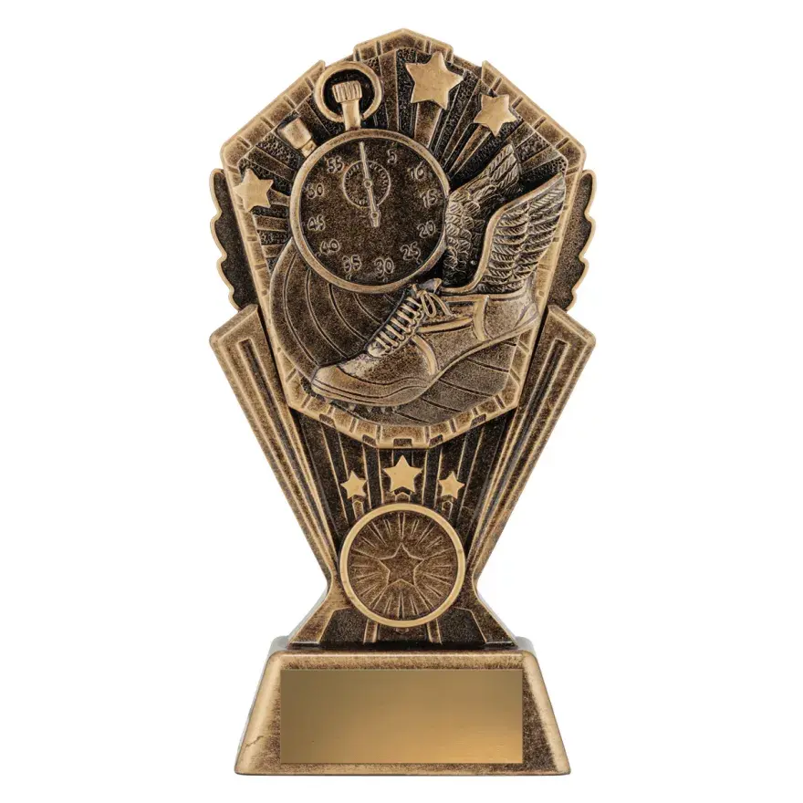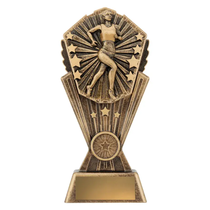 The Peak Series is an innovative trophy series offering super value for such an impressive size range. An elevated design that showcases a female runner against a vibrant sunray background.