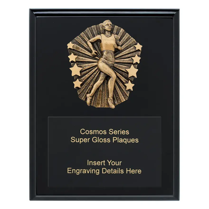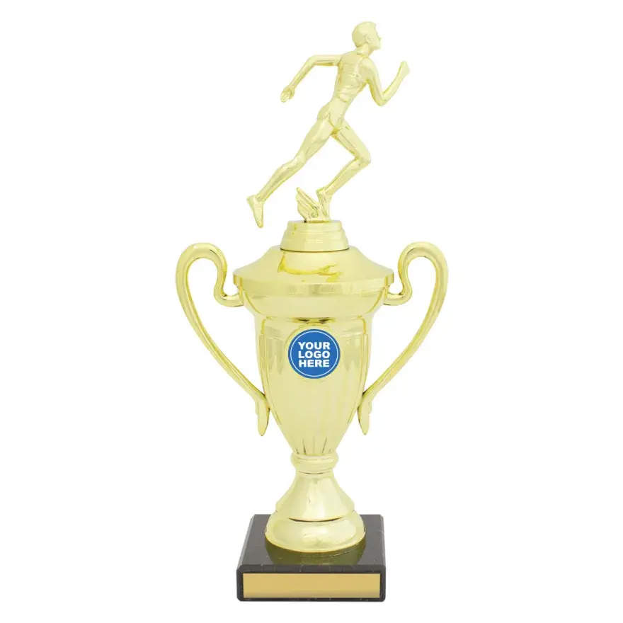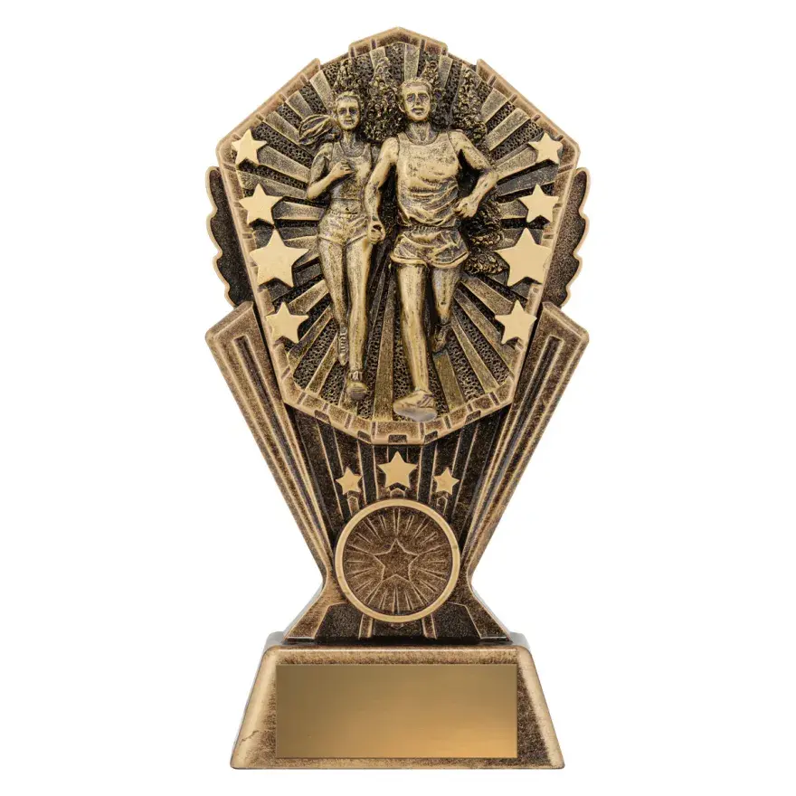 Exciting design of acrylic trophy showcases the gold theme for your sport or trophy. An affordable award with terrific space for your engraving.