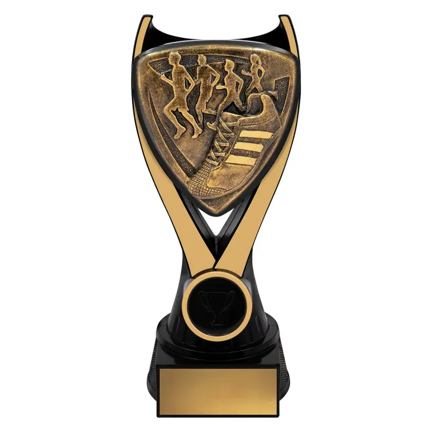Athletics trophy series in 3 sizes in classic antique silver and gold colour combination. A star inspired design featuring running shoe, track stop-watch and running track. Budget award option ideal for bulk and participation orders.