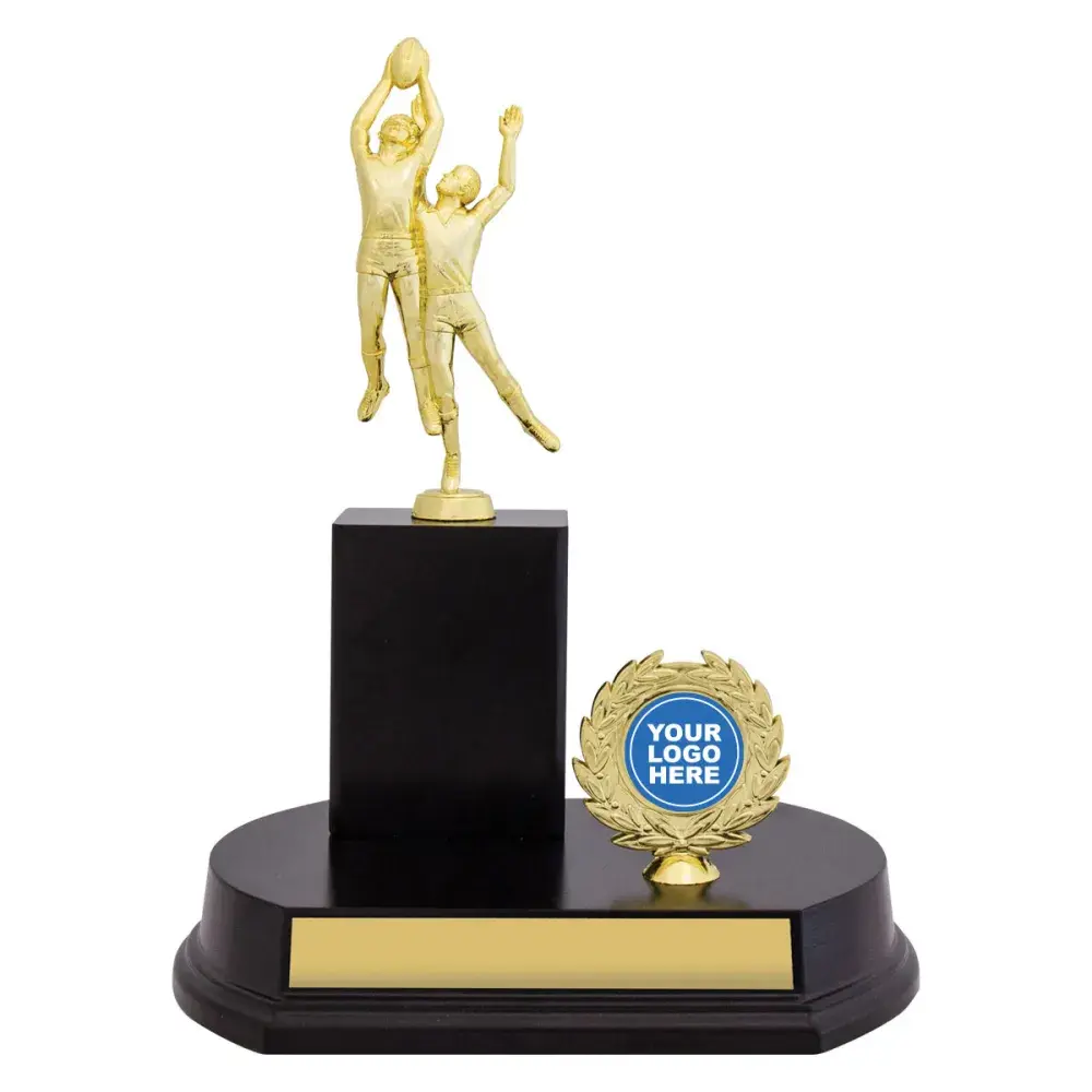 Distinctive design of timber trophy highlights the top for your sport and showcases your custom logo. Available in multiple sizes.