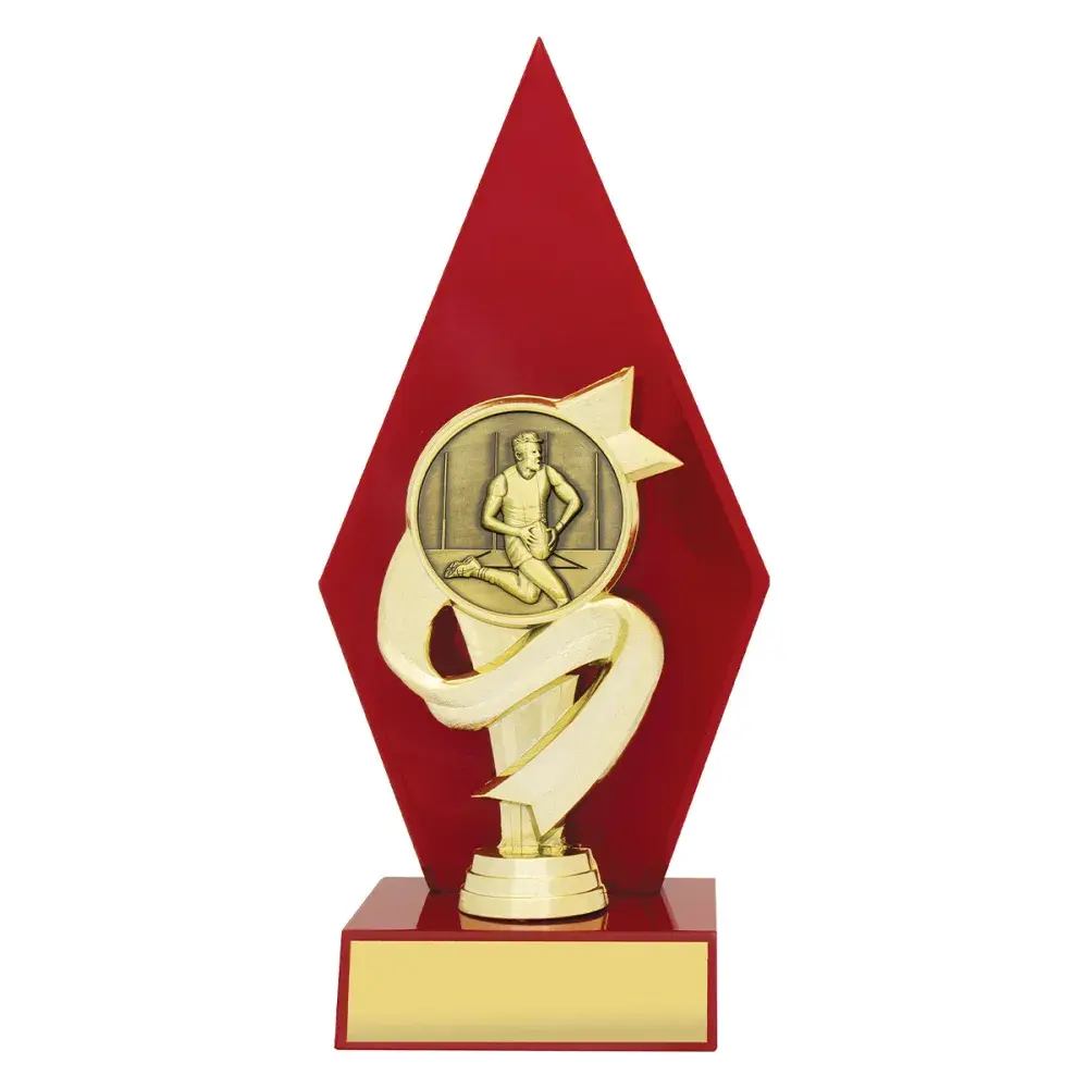 Brilliant timber arrow trophies feature player in action theme. Available in male or female. Timber available in different colours.
