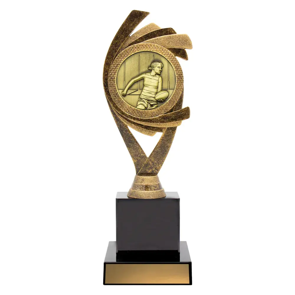 Dynamic design of holder trophies rendered in antique gold colours - male or female available.