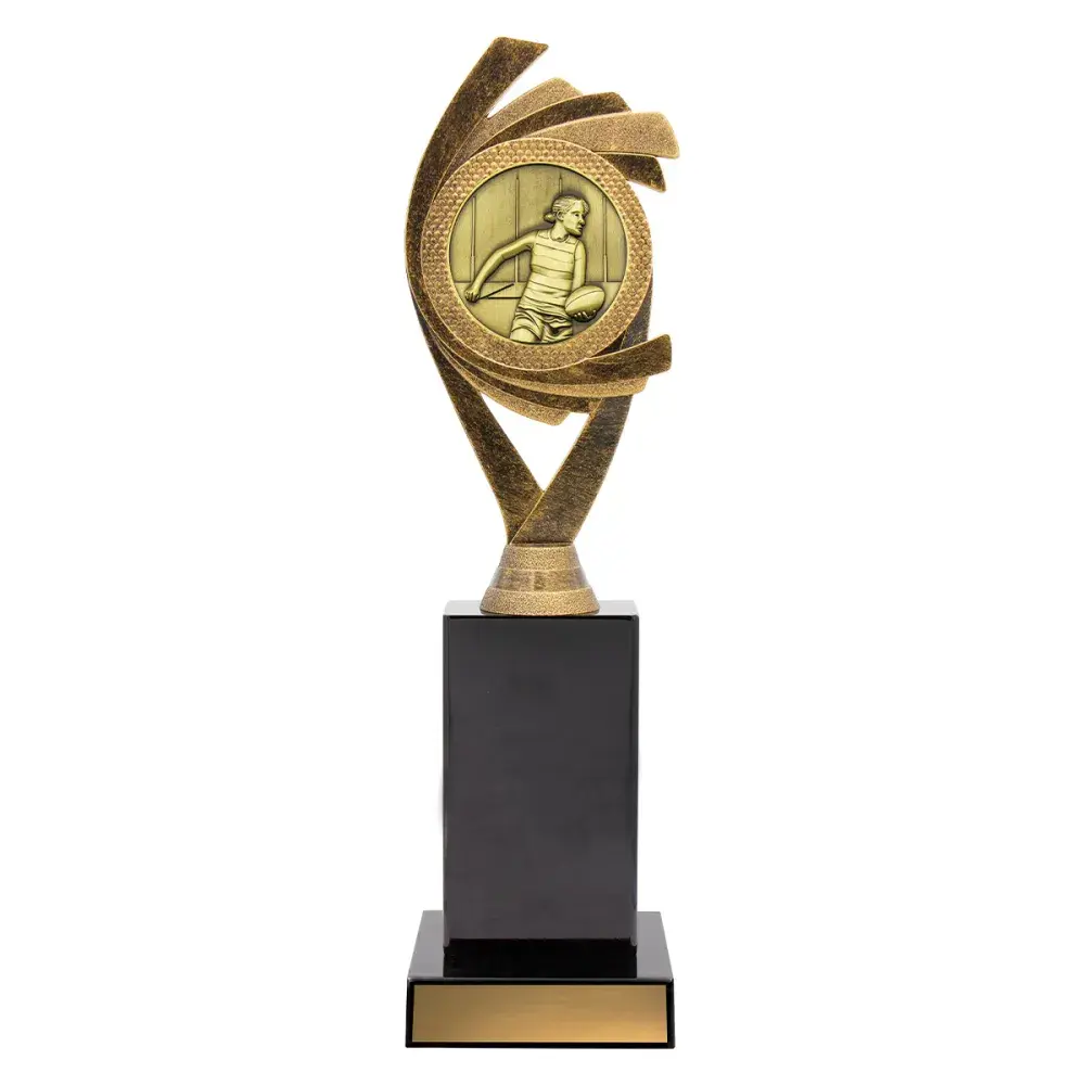 Dynamic design of holder trophies rendered in antique gold colours - male or female available.