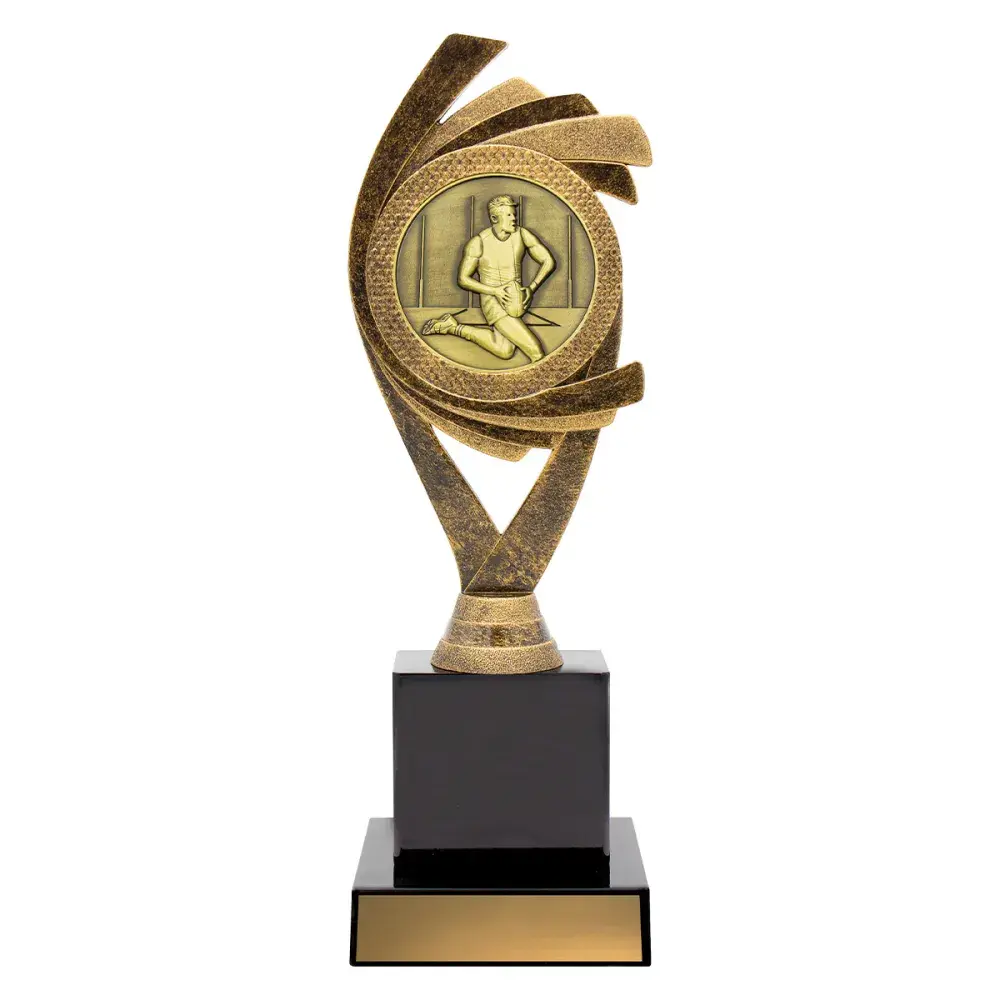 Dynamic design of holder trophies rendered in antique gold colours - male or female available.