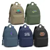 Affordable backpack which is manufactured from 450gsm heavy cotton canvas. It has a zippered main closure and adjustable woven shoulder straps with padding. Other features include an internal slip pocket for a laptop, a large zippered front pocket, a woven carry handle and two side pockets which double as a drink bottle holder.