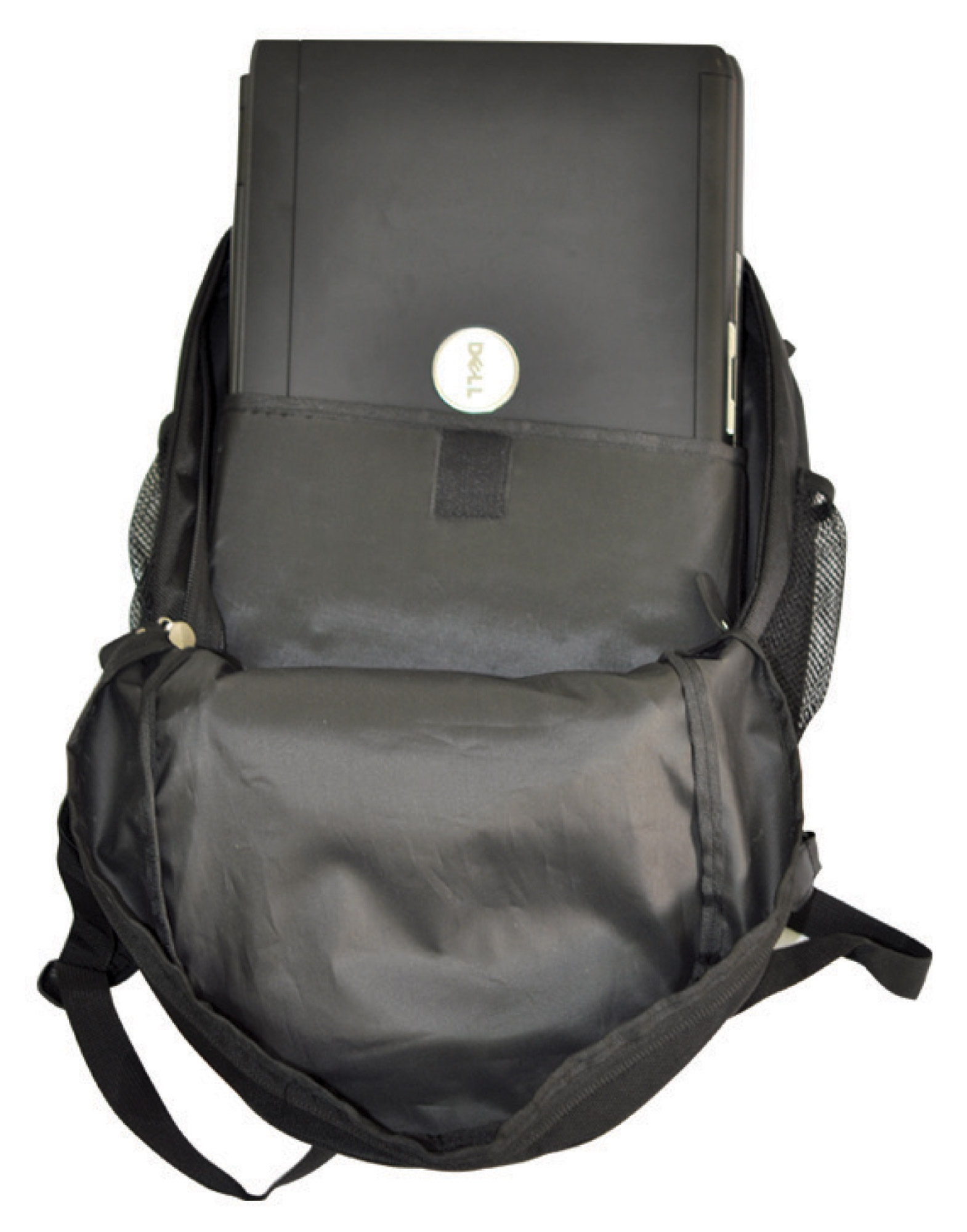 Features: Double zippered large main compartment. Padded laptop pocket with velcro closure in the large main compartment. Single zippered phone /CD /MP3 player pocket secured with leather edging on top of main compartment for documents. Double zippered front compartment contains phone pocket, elastic pen holder, card holder, ID windw with screen mesh, key clip holder, single zippered pocket for wallet. Elastic mesh slip pockets on sides. Padded air mesh back panels and straps.