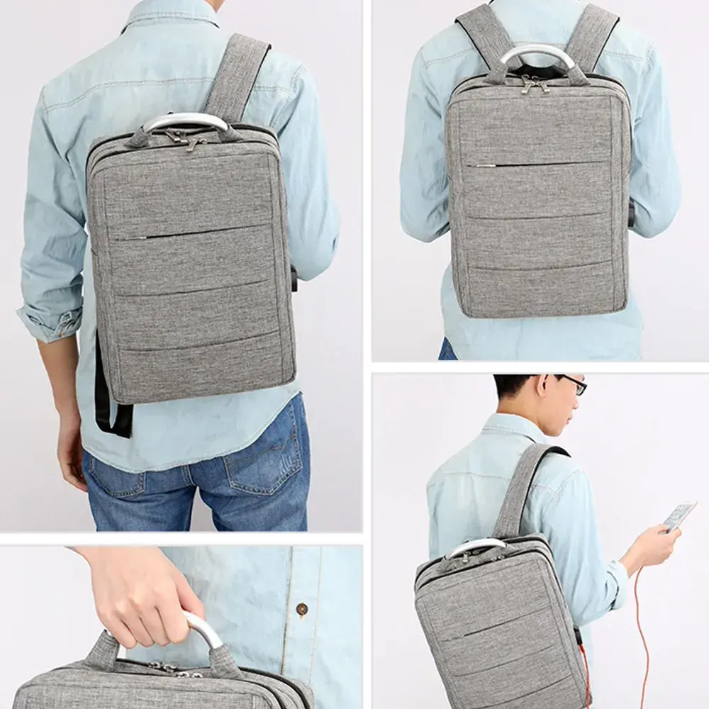 This modern stylish laptop backpack is made from high quality sponge nylon and has one front zipped pouch. The bag is combined with 2 complete independent front and back compartments front compartment has 2 small pouches and a pen holder the back compartment has a large pouch with black velcro closure strap for laptop and iPad this pouch is padded thicker to protect inside laptop and iPad. It also features USB charging port with a charging cord attached (inside power bank not included) and adjustable straps. Bag has a zip closure top for both compartments an aluminium handle in the middle is for you to carry the bag by hand.