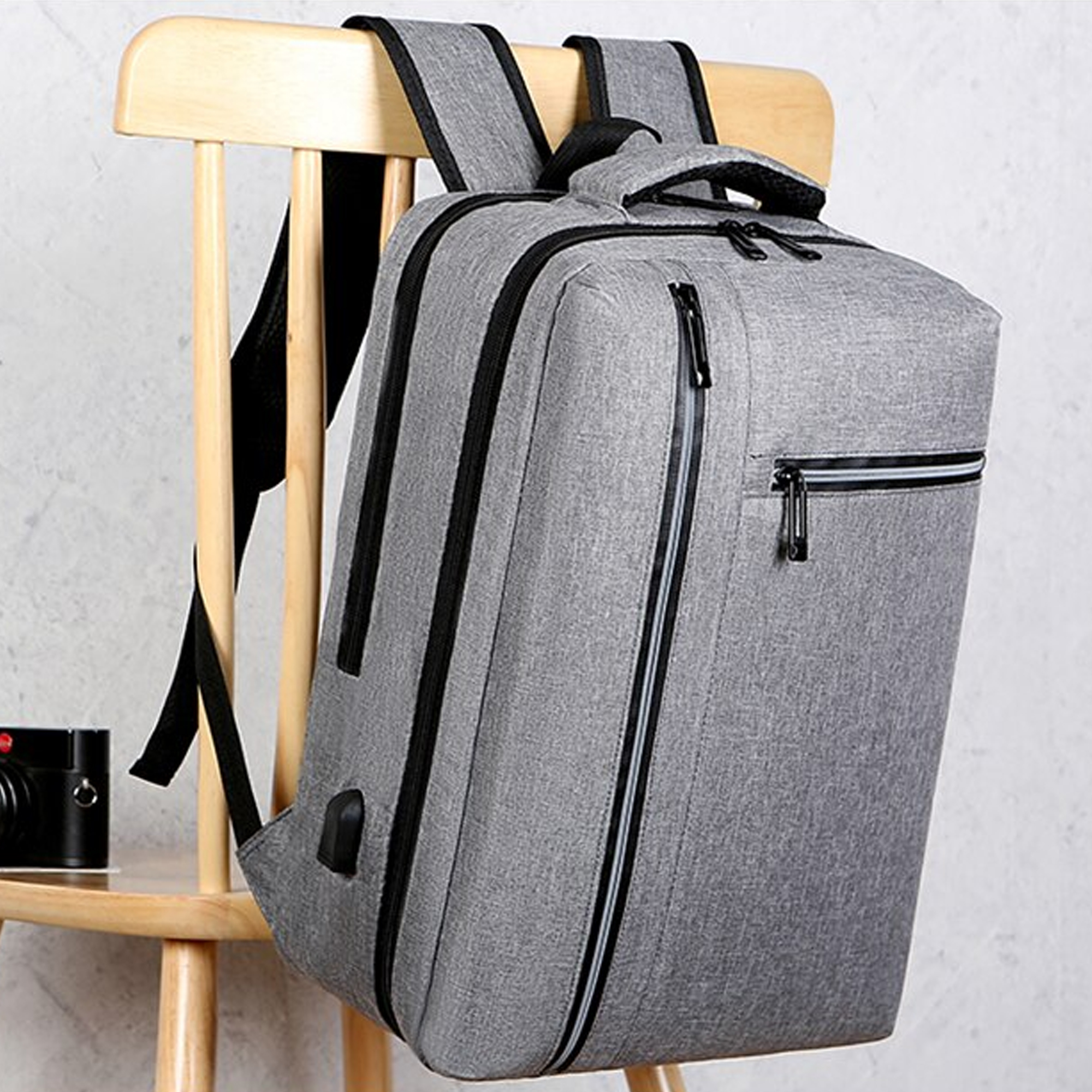 This fashionable business/school backpack is manufactured from quality 300D Oxford fabric with 200D polyester inside lining. Features independent 2 compartments the back compartment has a large pouch with a velcro closure strap for laptop and iPad. This pouch is padded thicker to protect inside laptop and/or iPad. The front compartment is a large side zipped opening pouch on top of this front compartment it has a front zipped pouch a zipped net pouch on the bottom a small pouches and 2 pen holders. On the back of this compartment it has elastic straps and clip to hold the contents. It also features USB charging port with a charging cord attached (inside power bank not included) and adjustable straps. The cross strap on the back is to hold the bag onto luggage handle. On the front of bag it has fashionable designed 2 zipped large pouches.