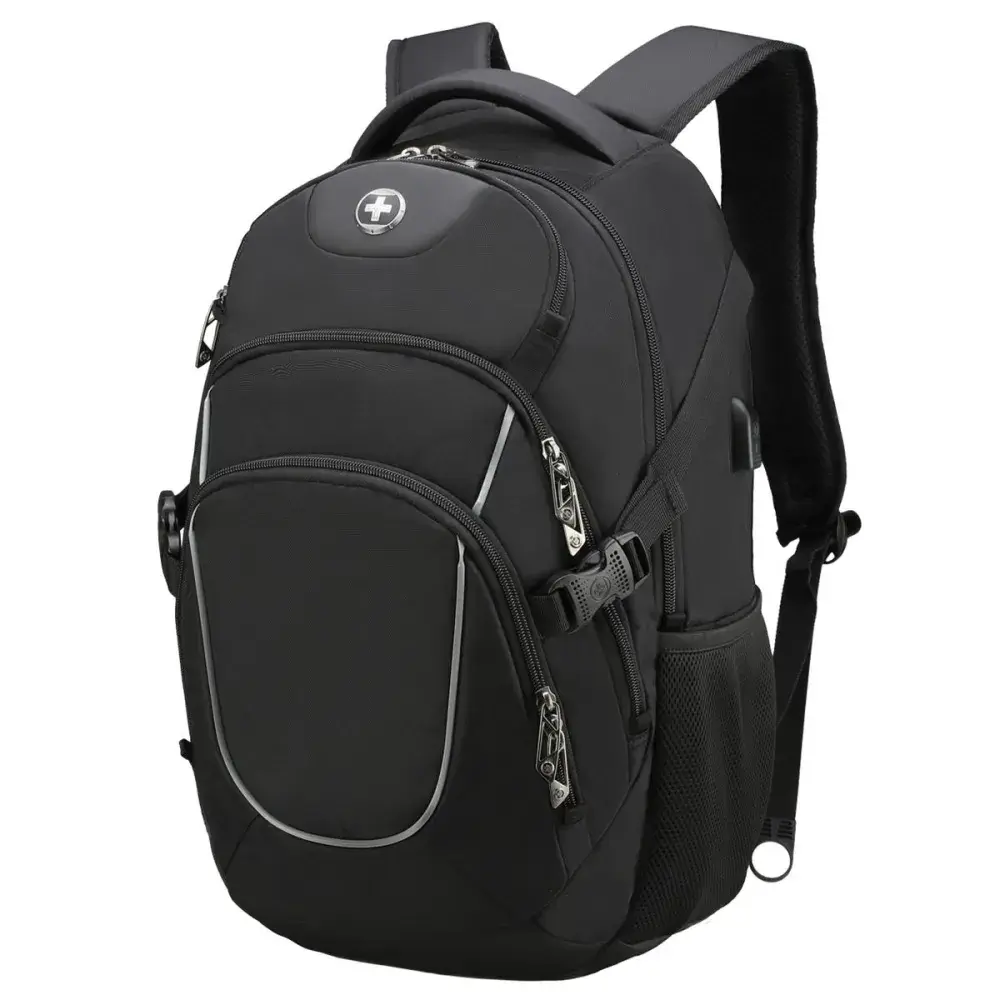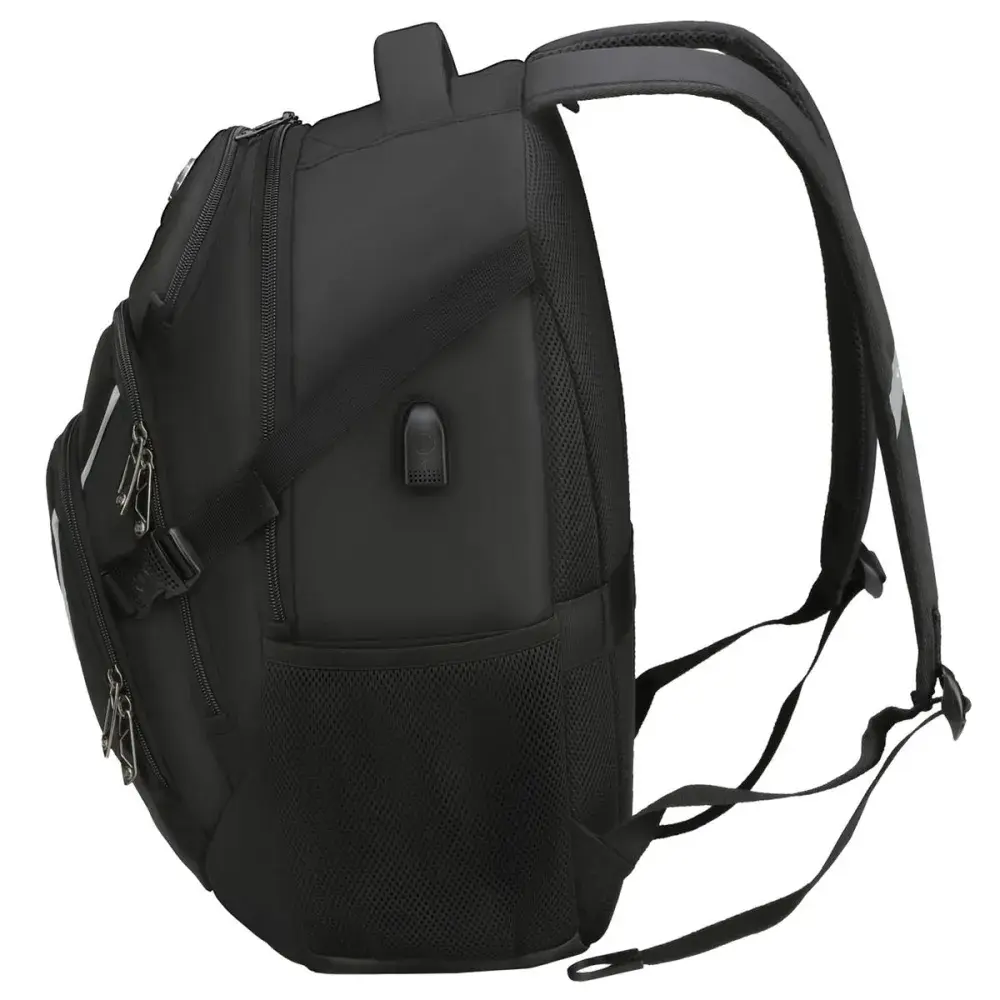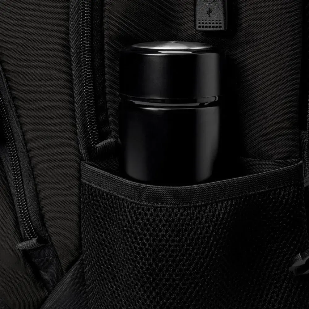 The Vector is built for those who value sleek design, smart functionality, and everyday reliability. With a 45L capacity, durable materials, and strategically breathable air-mesh padding, it delivers comfort and strength in equal measure, perfect for work, study, or travel.Stay connected with the patented smart USB interface and built-in cable, and keep your essentials protected with RFID security and a padded 16″ laptop compartment. Designed with S-curve ergonomic shoulder straps, a trolley sleeve, and multi-function pockets including dedicated spaces for a water bottle and sunglasses, the Vector keeps everything within easy reach.Finished in a modern black tone with multiple decoration areas and a reinforced strap, the Vector offers the perfect balance of utility, comfort, and refined branding potential.