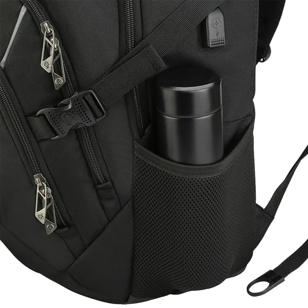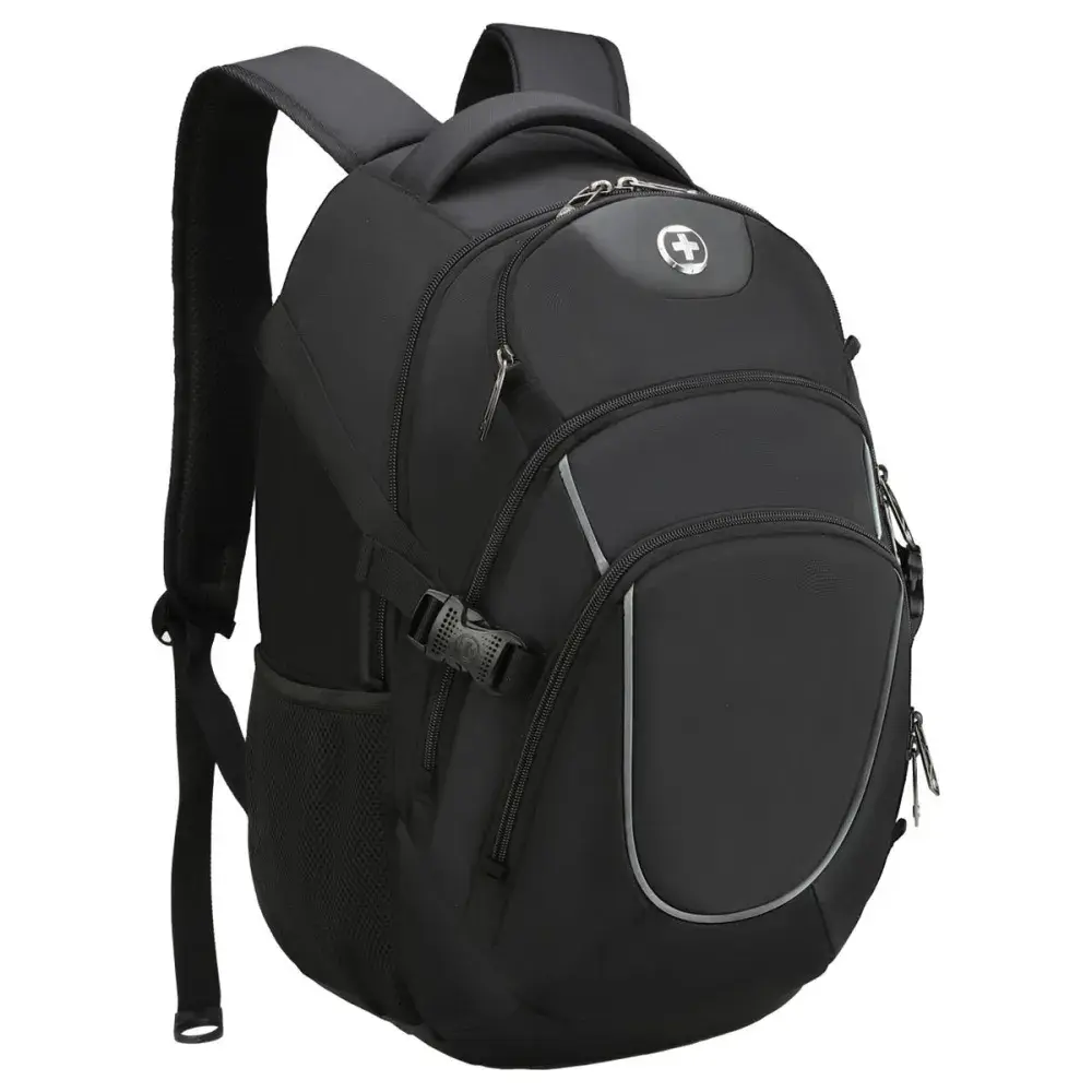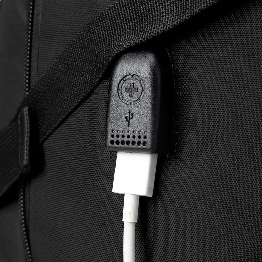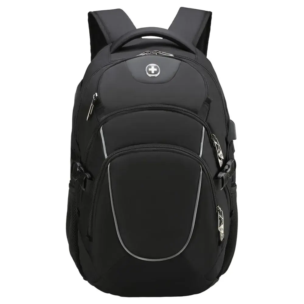 The Vector is built for those who value sleek design, smart functionality, and everyday reliability. With a 45L capacity, durable materials, and strategically breathable air-mesh padding, it delivers comfort and strength in equal measure, perfect for work, study, or travel.Stay connected with the patented smart USB interface and built-in cable, and keep your essentials protected with RFID security and a padded 16″ laptop compartment. Designed with S-curve ergonomic shoulder straps, a trolley sleeve, and multi-function pockets including dedicated spaces for a water bottle and sunglasses, the Vector keeps everything within easy reach.Finished in a modern black tone with multiple decoration areas and a reinforced strap, the Vector offers the perfect balance of utility, comfort, and refined branding potential.