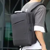 This modern stylish laptop backpack is made from high quality sponge nylon and has one front zipped pouch. The bag is combined with 2 complete independent front and back compartments front compartment has 2 small pouches and a pen holder the back compartment has a large pouch with black velcro closure strap for laptop and iPad this pouch is padded thicker to protect inside laptop and iPad. It also features USB charging port with a charging cord attached (inside power bank not included) and adjustable straps. Bag has a zip closure top for both compartments an aluminium handle in the middle is for you to carry the bag by hand.