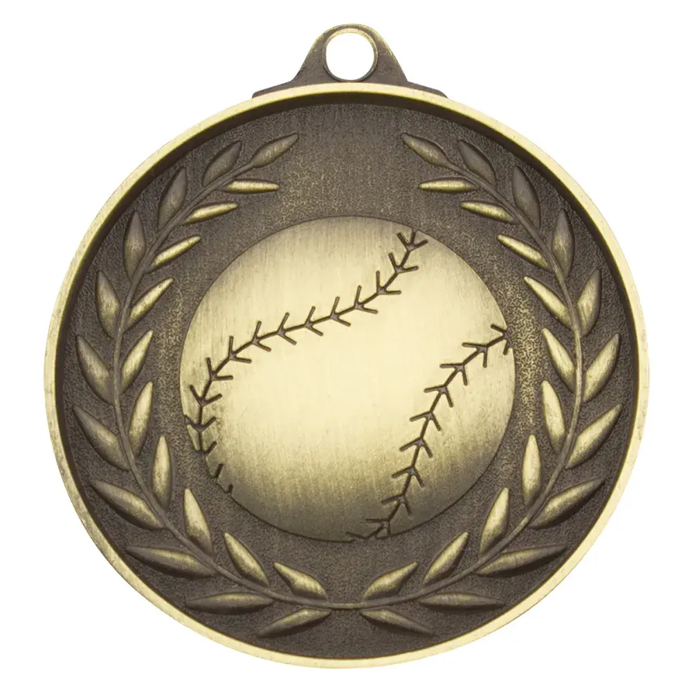 Classic wreath inspired medal for Baseball / Softball. A generic theme suitable for all players features the iconic ball and celebratory wreath representing high achievement.