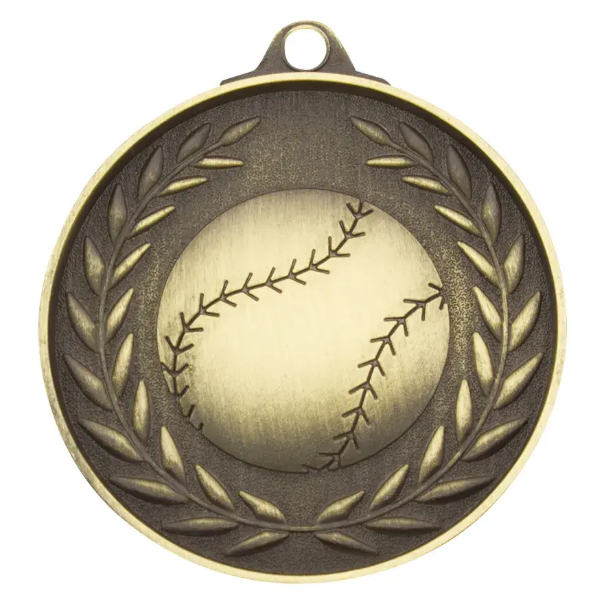 Antique gold, silver and bronze medals for Baseball or Softball. A classic design, the Sunraysia Medal series feature classic elements - ball, glove and bat. Medals feature an extra thick edge and a rectangle panel on the back of the medal for your engraving.