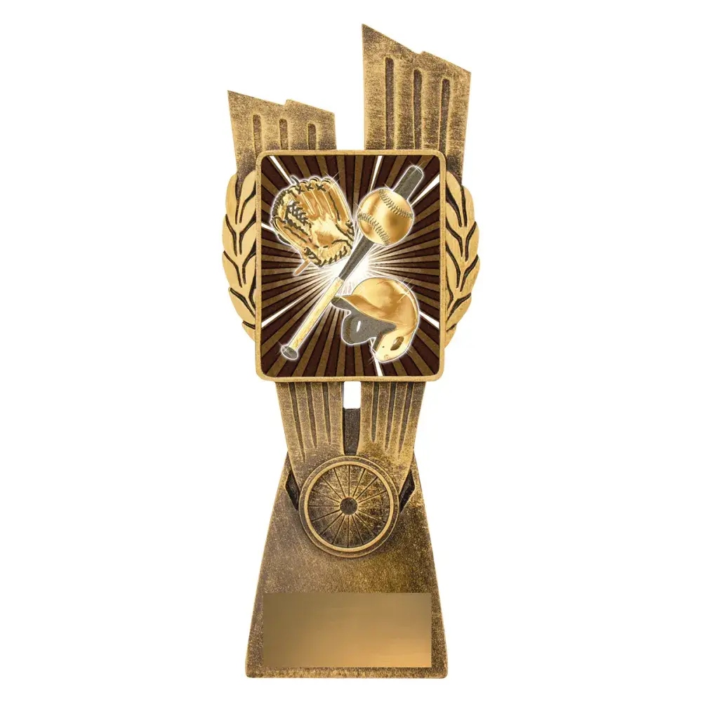 Antique Gold Lynx trophy features a classic wreath design and vibrant theme for baseball and softball. Trophies offer the option of including your custom logo over various sizes.