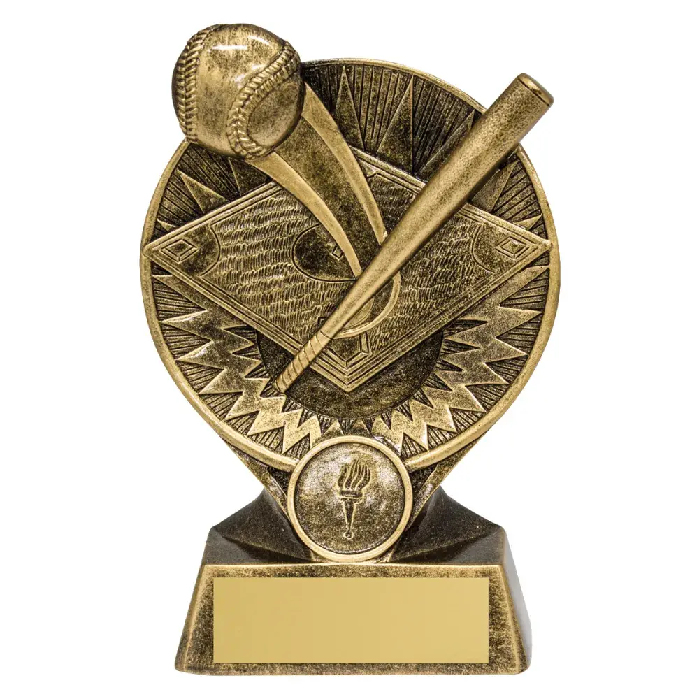 The Panorama series of baseball trophies are presented in classic gold colours and feature an attractive design of diamond, ball and bat. Available in 2 sizes and with space for 25mm insert if required.