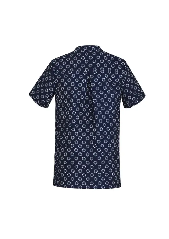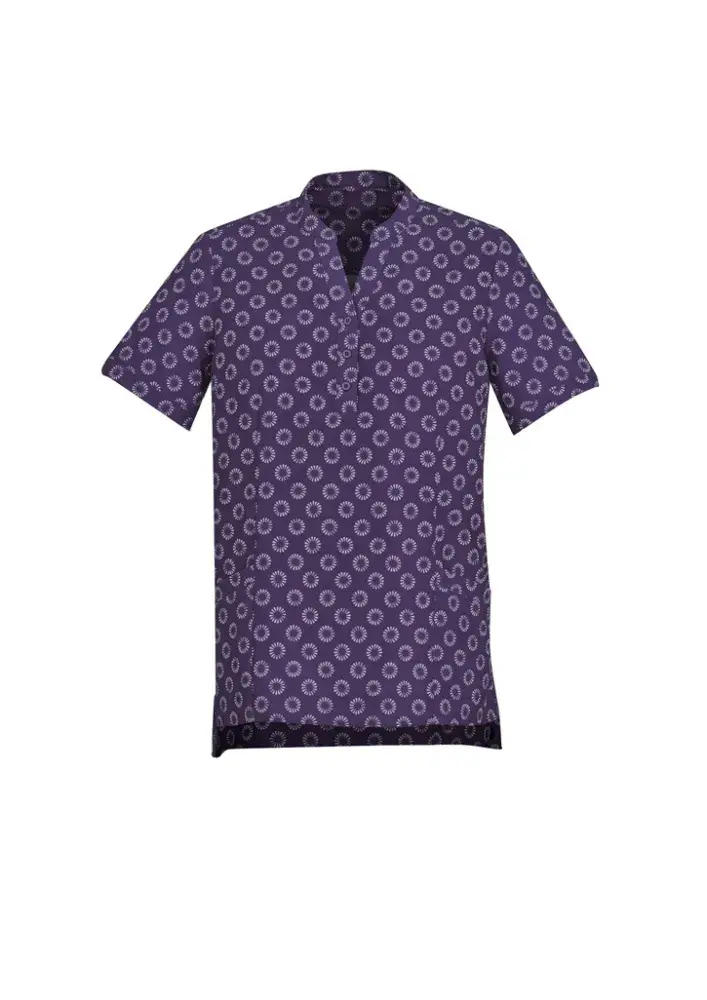 Styles features longer hem lengths, hidden bust button on short sleeve style, side splits and pockets.