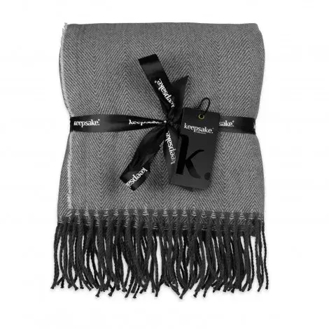 The luxurious, ultra-soft Keepsake Throw Blanket adds warmth and style to any space. Crafted from 100% recycled polyester, it features a soft grey herringbone pattern, accented with charcoal tassels and a subtly frayed edge for added character. Ideal for home, office, or travel, it is presented with a Keepsake branded ribbon and hangtag.