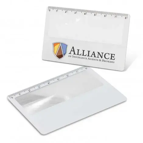 Handy credit card sized magnifier with an 8cm ruler on one edge.