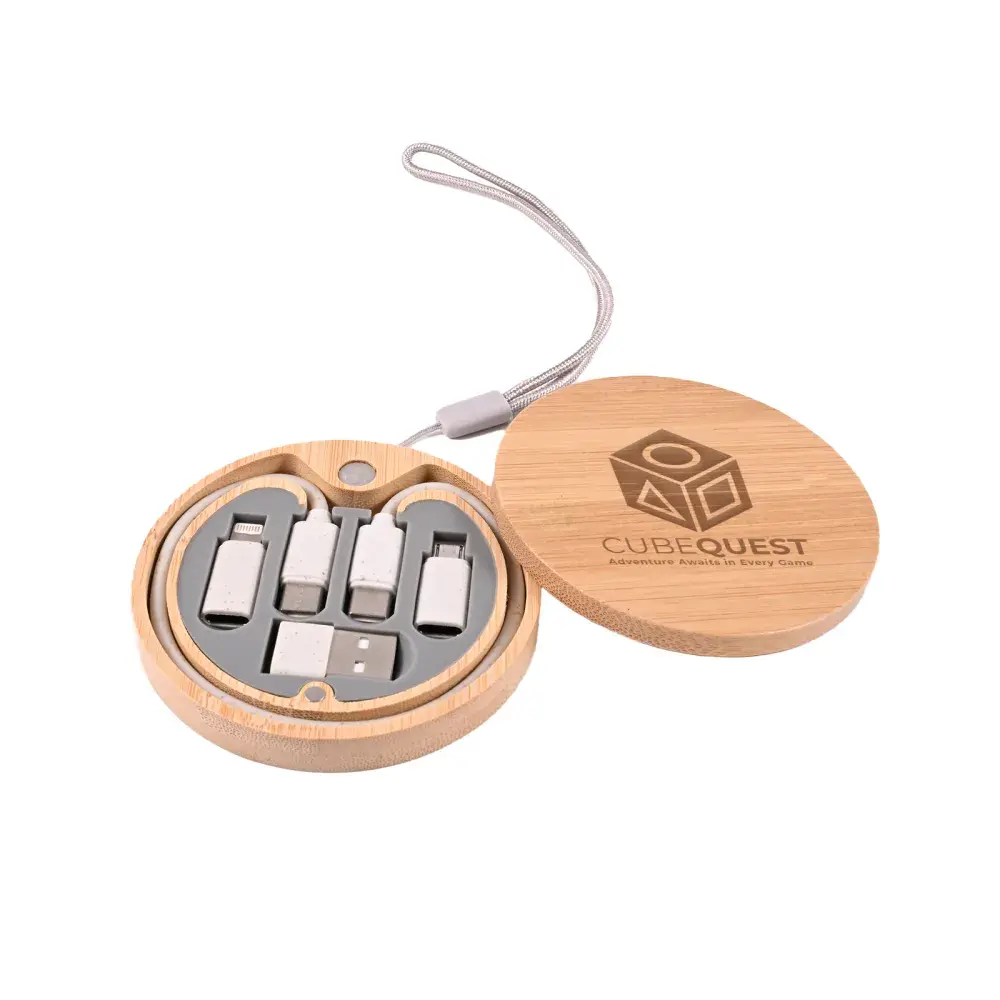 Introducing the Reveal Circle Cable Set – a stylish and eco-conscious charging solution designed with natural bamboo and wheatstraw accents. The round bamboo cable set features a lid that slides open effortlessly, thanks to its magnetic design, providing easy access to the charging essentials within. A grey braided carry strap adds a convenient touch. Under the lid, discover a Type C to Type C cable alongside Type A, Micro USB, and iOS connectors, ensuring compatibility with a variety of devices. Crafted from wheat straw, both the cable and connectors are environmentally friendly, with a grey insert in the base for secure storage. Supporting fast charging, this versatile and aesthetically pleasing cable set is not only functional but also showcases eco-conscious qualities. Elevate your charging experience with the Reveal Cable Set – where style meets sustainability in a compact and visually appealing design.