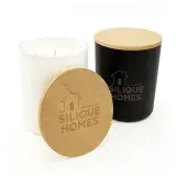 Enhance any room with the Gleam Glass Candle, a 200g vanilla-scented soy wax candle in a sleek black or white glass jar topped with a natural bamboo lid. With an approximate burn time of 40 hours, this candle offers long-lasting ambience. Perfectly presented in a kraft box, it makes a wonderful gift or an elegant addition to any space. A safety label is affixed to the base for added convenience.