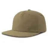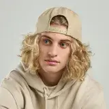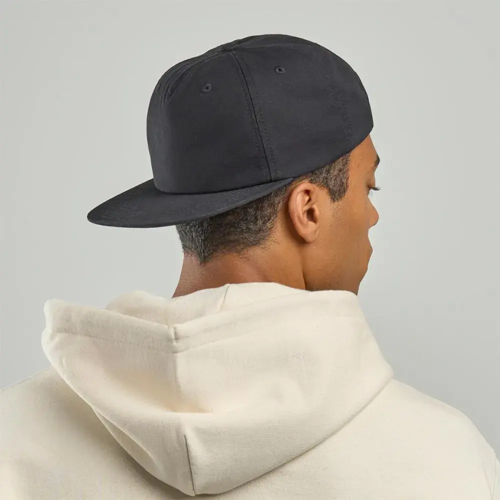 Unstructured, old-school cap made of a blend of recycled and organic cotton canvas. It features a flat visor and a recycled snapback closure.