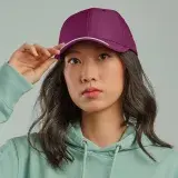 A 6-panel baseball cap in polyester jacquard fabric, with a contrasting piping on visor and long velcro strap closure at rear.