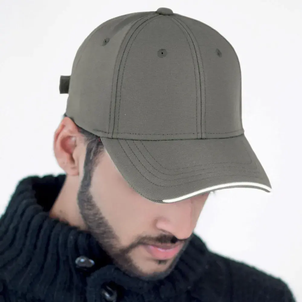 A 6-panel baseball cap in polyester jacquard fabric, with a contrasting piping on visor and long velcro strap closure at rear.