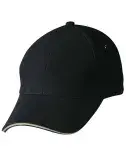 Description: 6 panel structured laid back front. Pre-curved peak with contrasting sandwich. 4 metal eyelets on 4 panels & tuck in fabric strap with gun metal buckle.
