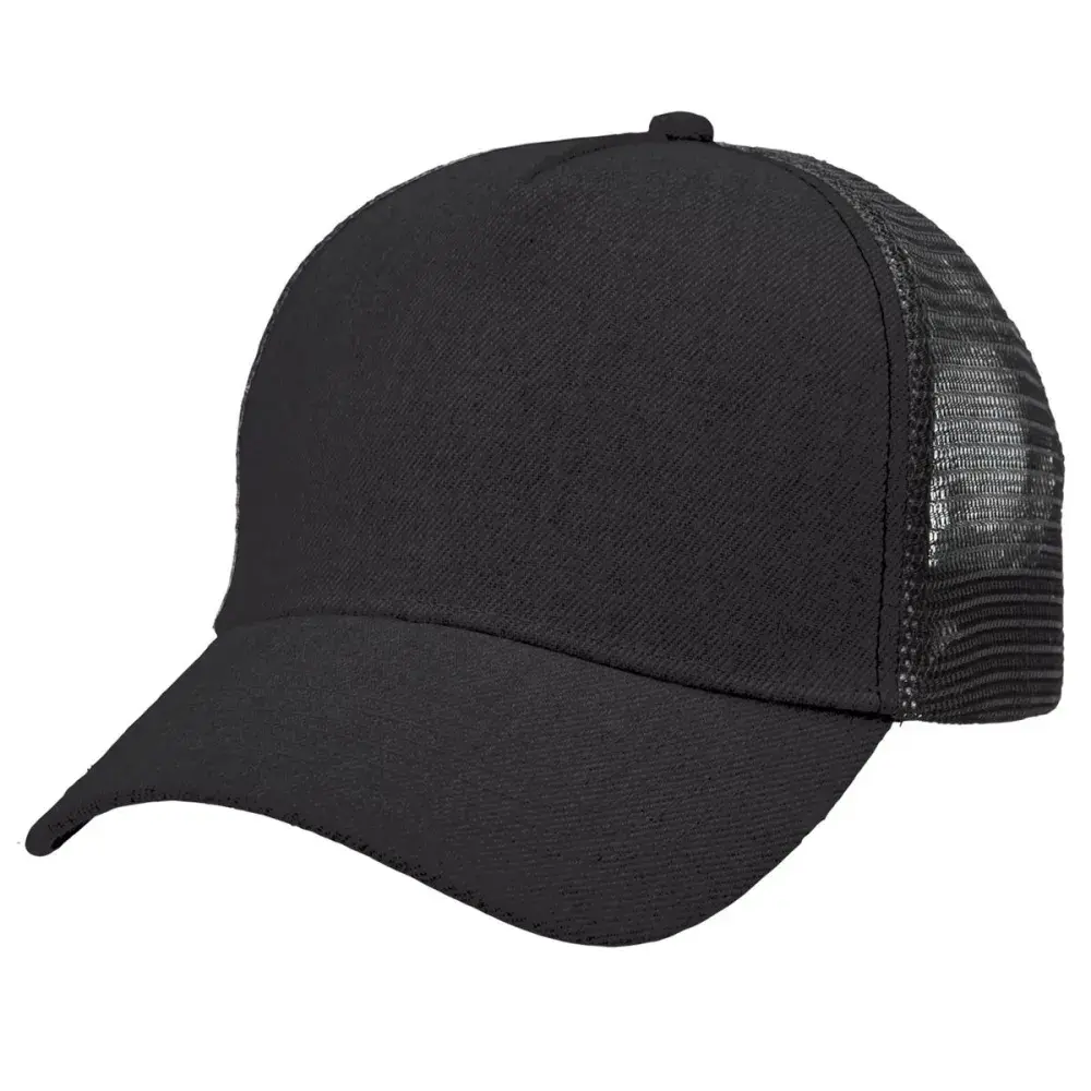 Heathered polyester fabric peak and front panel with nylon mesh side and back panels