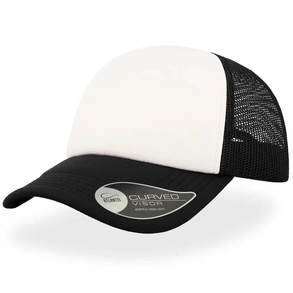 High crown trucker cap with polyester foam front panel as side and back panels in mesh material and a PVC closure.