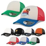 High crown trucker cap with polyester foam front panel as side and back panels in mesh material and a PVC closure.