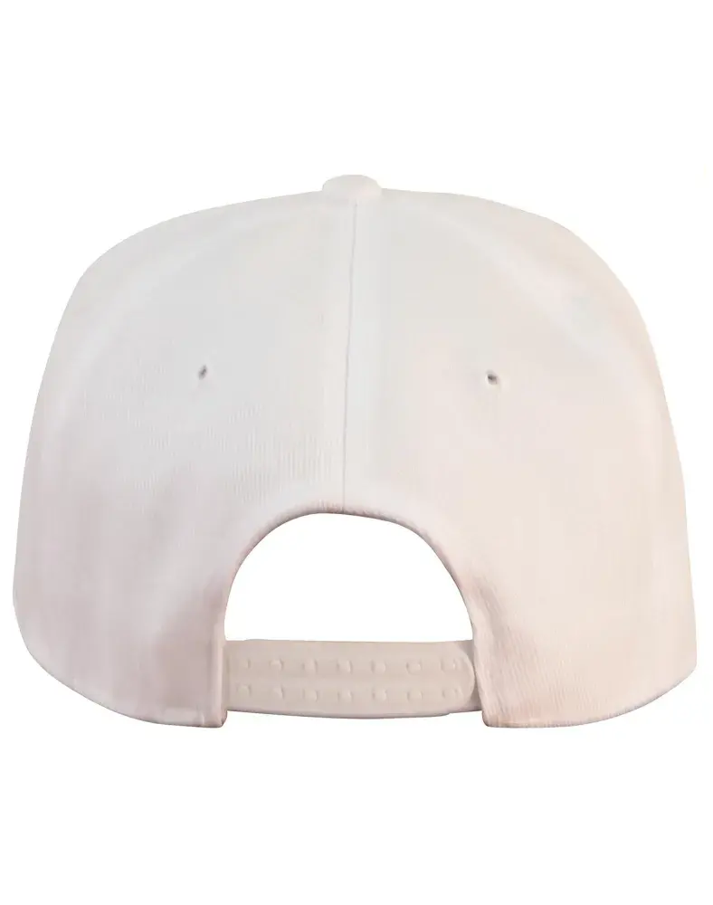 Description: 6 panel structured design with flat peak. Padded sweatband made of cotton fabric. Plastic snapback fastener. Stitched eyelets.