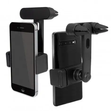Stylish spring-loaded car phone holder which has a very prominent branding area. It has a soft rubber clip which pushes onto car air vents and securely holds a phone so it can be seen by the driver and used as a GPS.