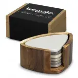 Functional set of six ceramic coasters in the shape of New Zealand river stones, each in a different shade of neutral grey and taupe, with a compact acacia wood holder for storage. Presented in a natural gift box with a branded black sleeve.
