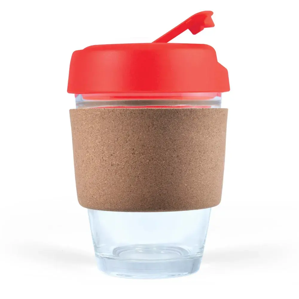 320ml glass reusable coffee cup. Heat-resistant cork band and secure fitting lid. Made from Borosilicate glass known for its durability and thermal shock resistance. Select your choice of lid and flip piece colour. Packed in a kraft gift box. For logo longevity, hand washing is recommended. Eco Credentials: Reusable, sustainable, printed using renewable energy.