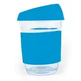 320ml glass reusable coffee cup. With silicone sleeve and lid. Made from Borosilicate glass known for its durability and thermal shock resistance. Select your choice of lid and silicone sleeve colours. Packed in a kraft gift box. For logo longevity, hand washing is recommended. Eco Credentials: Reusable, sustainable, printed using renewable energy.