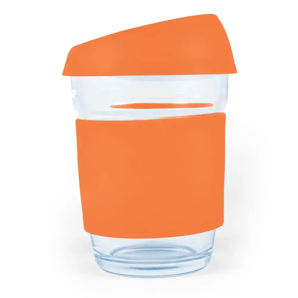 320ml glass reusable coffee cup. With silicone sleeve and lid. Made from Borosilicate glass known for its durability and thermal shock resistance. Select your choice of lid and silicone sleeve colours. Packed in a kraft gift box. For logo longevity, hand washing is recommended. Eco Credentials: Reusable, sustainable, printed using renewable energy.
