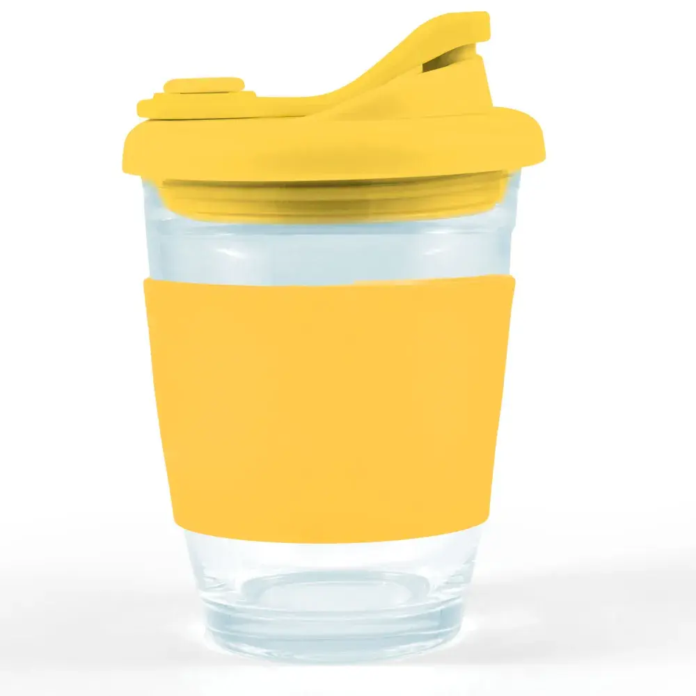 320ml glass reusable coffee cup. With secure fitting polypropylene lid silicone lid and sleeve. Made from Borosilicate glass known for its durability and thermal shock resistance. Nominate your choice of lid and sleeve colours. Packed in a kraft gift box. Hand washing recommended.