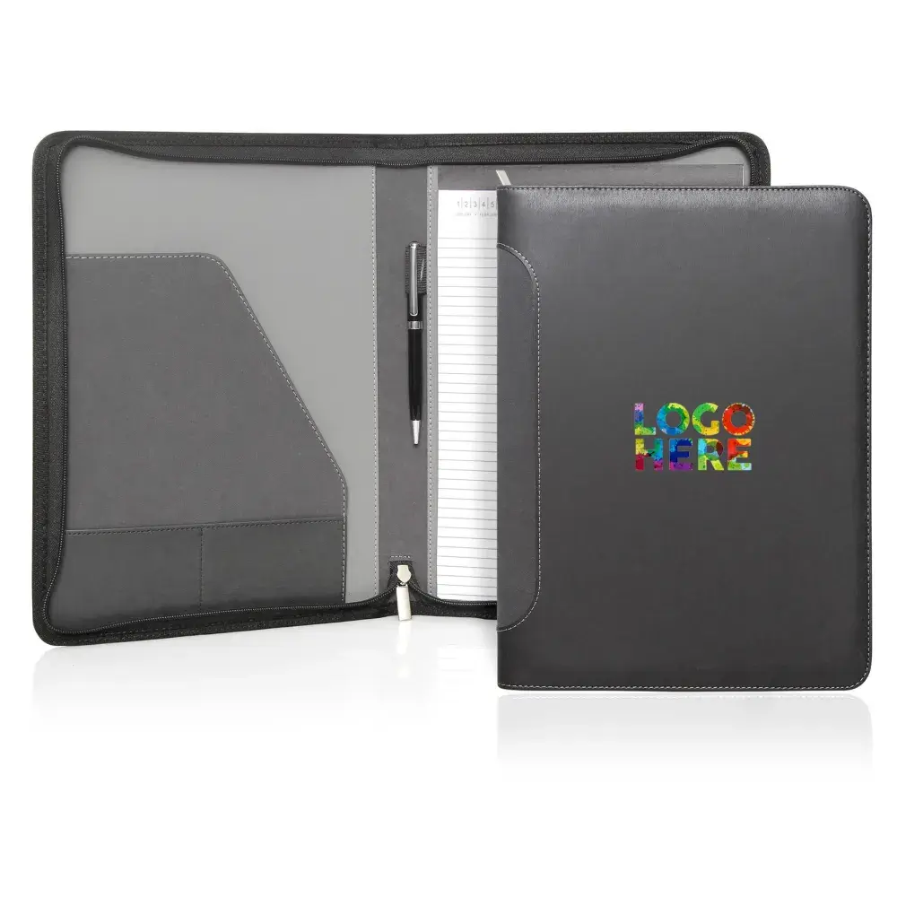Elegantly designed with an ultra-soft, leather-look PU finish and minimalist aesthetic, this zippered compendium features a notepad, sleeve, pen loop, and business card holders.